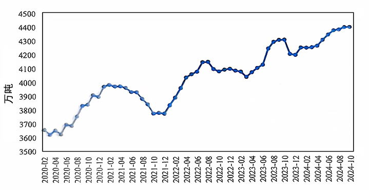 2024年10月,國(guó)內(nèi)電解鋁繼續(xù)保持穩(wěn)定生產(chǎn)。10月國(guó)內(nèi)電解鋁建成產(chǎn)能4462萬(wàn)噸/年,運(yùn)行產(chǎn)能4363萬(wàn)噸/年,較上月增加12萬(wàn)噸/年,主要因?yàn)樗拇ā①F州等地技改產(chǎn)能逐步復(fù)產(chǎn)及新疆置換項(xiàng)目啟槽。本月開(kāi)工率約98%,為歷史新高。10月份產(chǎn)量為373萬(wàn)噸,環(huán)比增長(zhǎng)3.4%,同比增長(zhǎng)2.1%,日均產(chǎn)量12.0萬(wàn)噸,環(huán)比持平。