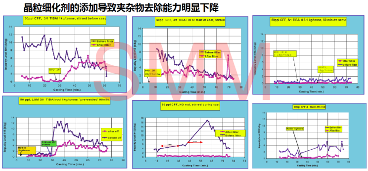 據(jù)丁總調(diào)查顯示,常用細(xì)化劑會(huì)對(duì)CFF過(guò)濾器的過(guò)濾性能產(chǎn)生負(fù)面影響,并隨較高的添加速率而惡化,并顯示晶粒細(xì)化劑種類對(duì)過(guò)濾性能影響不同。據(jù)業(yè)內(nèi)相關(guān)試驗(yàn)調(diào)查,鋁鈦碳或因無(wú)TiB2,從而減少對(duì)CFF過(guò)濾器的吸附、堵塞,會(huì)大大降低細(xì)化劑對(duì)過(guò)濾器性能的影響。