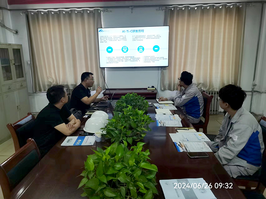我司于2024年6月26日與山東兗礦輕合金有限公司的高層領導和技術專家進行了一次深入的技術交流座談,就鋁鈦碳鑭在鋁棒熔鑄上,尤其在大直徑鋁棒上,相對于鋁鈦硼的性能優(yōu)勢以及降本能力進行了較為充分的交流,并初步擬定鋁鈦碳鑭試驗及驗證方案。